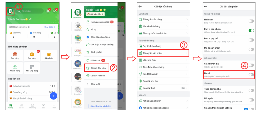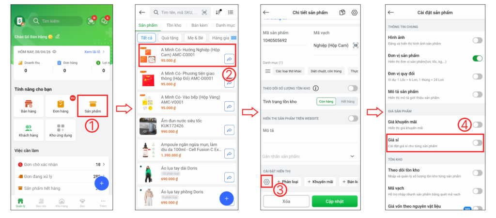 Cách 2: Tại màn hình chính, bạn chọn Sản phẩm (1), chọn sản phẩm bất kì (2), tại trang chi tiết sản phẩm bạn chọn biểu tượng Cài đặt (3), tại trang cài đặt sản phẩm bạn chọn bật/tắt Giá sỉ (4)