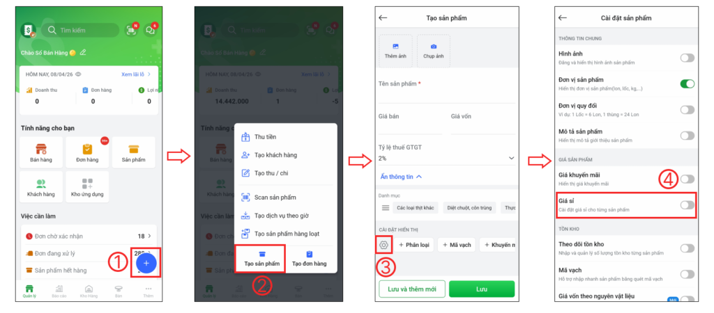 Cách 3: Tại màn hình chính, bạn chọn biểu tượng dấu cộng (+) góc phải dưới màn hình (1) > chọn Tạo sản phẩm (2), tại giao diện Tạo sản phẩm bạn chọn biểu tượng Cài đặt (3), tại trang cài đặt sản phẩm bạn chọn bật/tắt Giá sỉ (4)