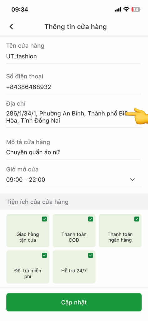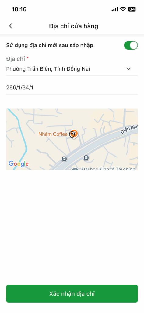 - Bước 3: Nhấp vào ô “Địa chỉ cửa hàng”, kiểm tra địa chỉ hiển thị đã đúng với thực tế mới hay chưa.
