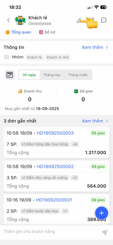 - Bước 1: Vào mục “Khách hàng” để xem danh sách và thông tin cần cập nhật địa chỉ mới. Nhấn vào mục “Chỉnh sửa” thông tin khách hàng.