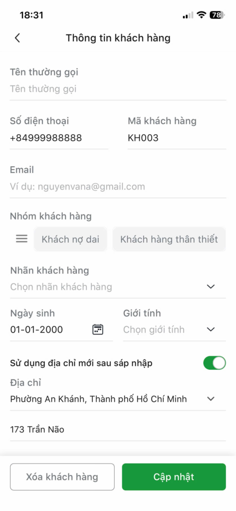 - Hiển thị sẵn thông tin khi chỉnh sửa: Khi người dùng mở phần chỉnh sửa địa chỉ của khách hàng, hệ thống sẽ tự động hiển thị lại thông tin đã lưu trước đó. Điều này giúp việc kiểm tra hoặc cập nhật diễn ra nhanh chóng, dễ dàng, hạn chế tối đa sai sót.