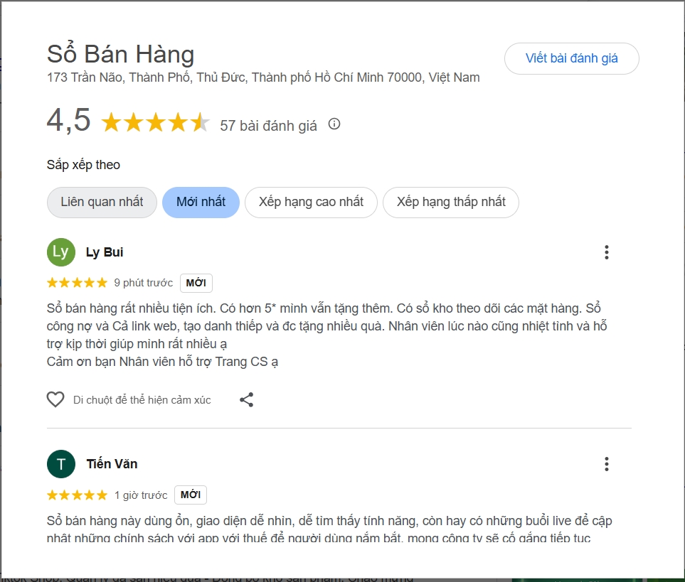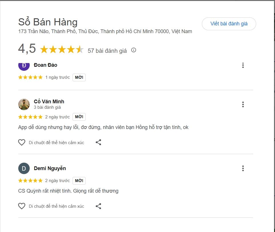 Bên cạnh đó, trên nền tảng Google Map, chúng tôi cũng nhận được nhiều nhận xét tích cực từ người dùng. Những lời khen này không chỉ là nguồn động viên to lớn mà còn là minh chứng cho sự nhiệt huyết của đội ngũ trong việc đưa Sổ Bán Hàng trở thành một công cụ quan trọng trong việc hỗ trợ các chủ kinh doanh vận hành hiệu quả mỗi ngày.