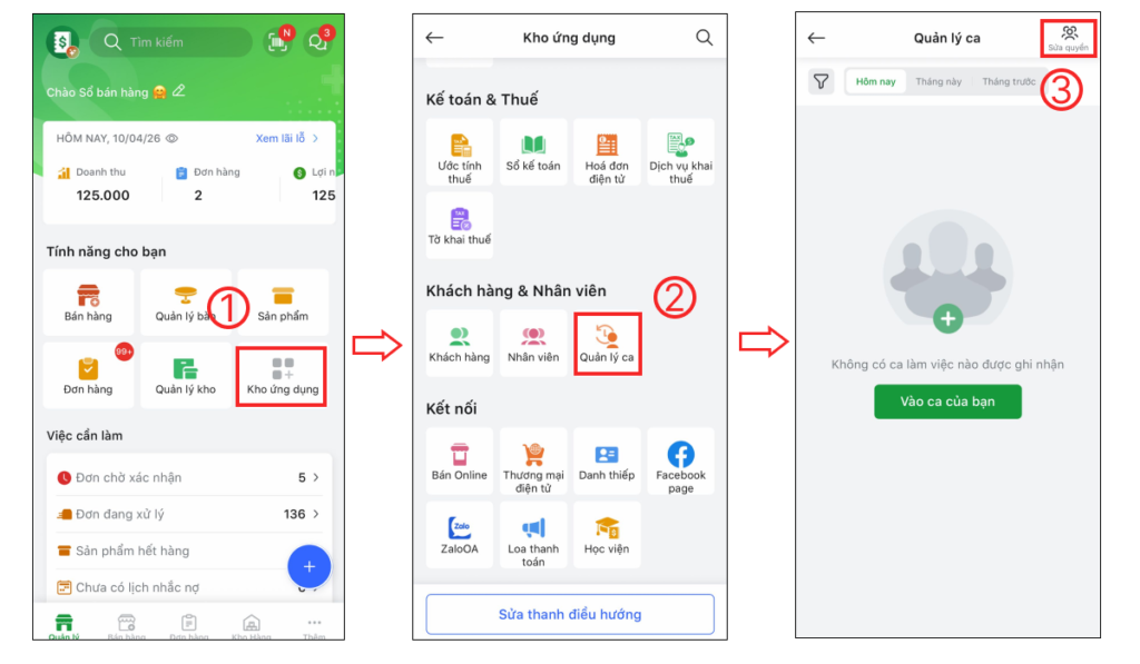 Bước 1: Tại màn hình Quản lý chọn Thêm tính năng (1) > chọn Quản lý ca (2) > chọn Sửa quyền (3).