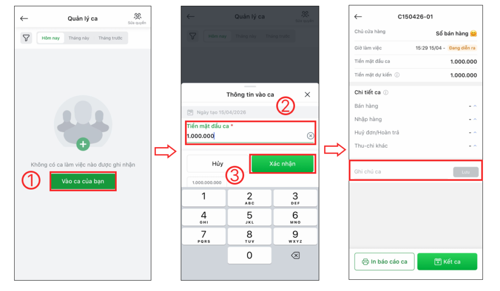 Tại màn hình Quản lý ca bạn chọn Vào ca của bạn (1) > nhập tiền mặt đầu ca (2) > xác nhận (3)