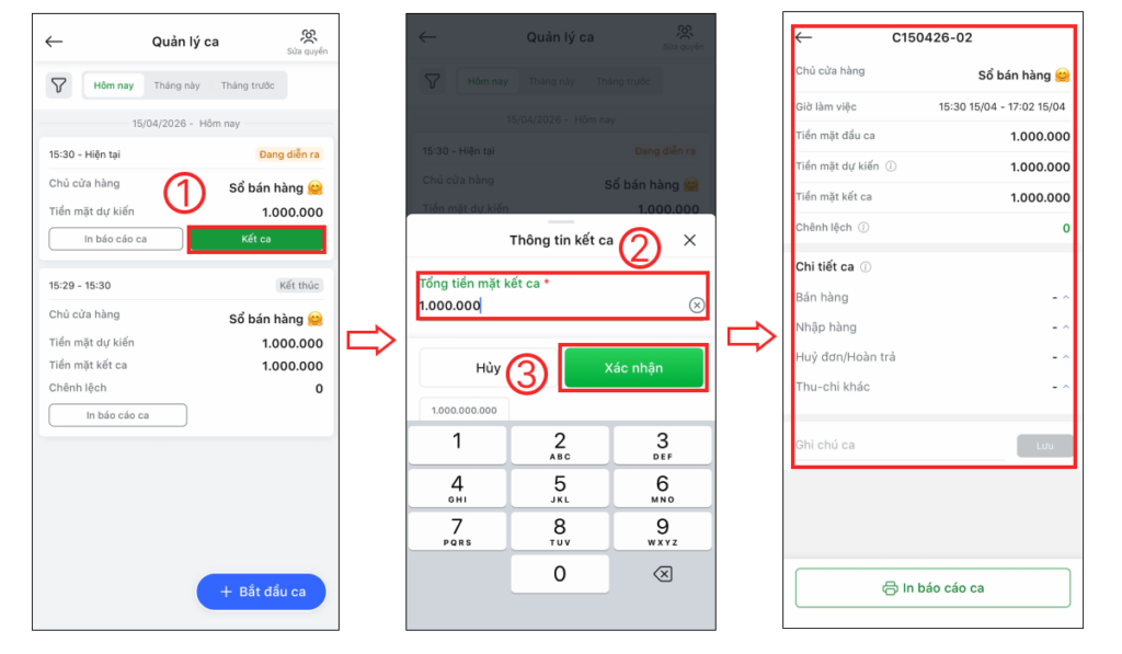 Tại màn hình Quản lý ca chọn vào mục Kết ca (1) > nhập tiền mặt kết ca (2) > Xác nhận (3)