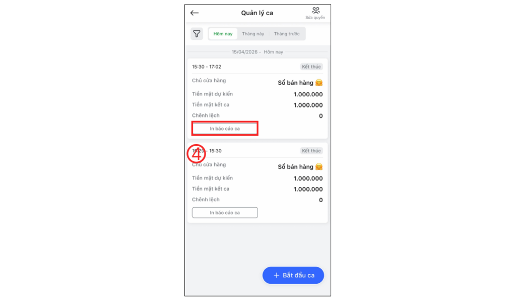 - Chênh lệch: sẽ được tính bằng [Tiền mặt kết ca] – [Tiền mặt dự kiến].