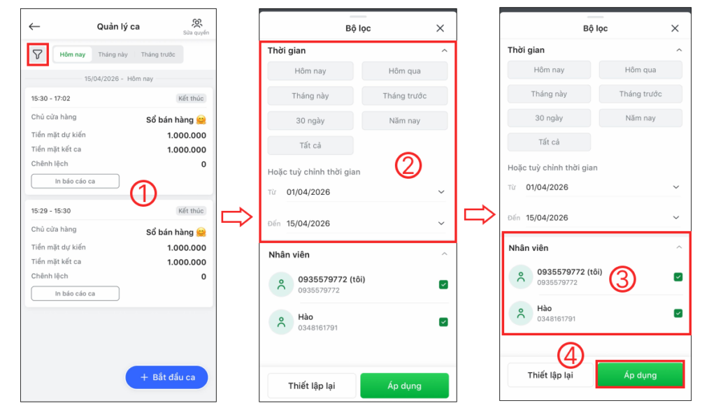 Chọn biểu tượng phễu (1) > chọn thời gian cần xem hoặc điều chỉnh theo thời gian (2) > Chọn nhân viên muốn xem lịch sử vào ca (3)