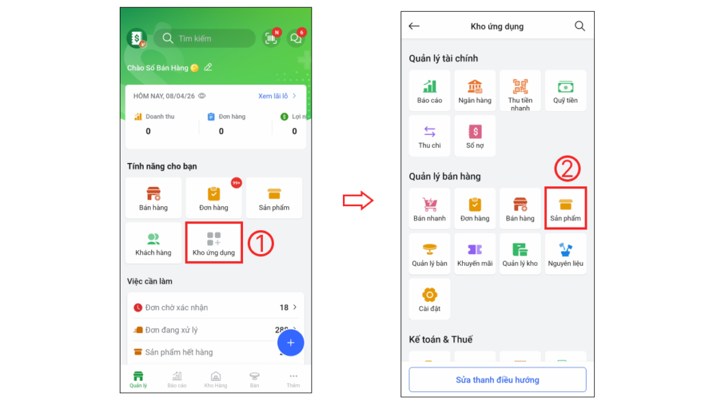 Bước 1: Tại màn hình tổng quan, bạn chọn Kho ứng dụng (1) > Sản phẩm (2)