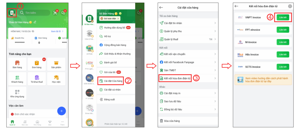 Bước 1: Tại màn hình chính, bạn chọn vào Logo cửa hàng (1) > chọn Cài đặt cửa hàng (2) > chọn Kết nối hóa đơn điện tử (3) > chọn Liên kết VNPT Invoice (4)
