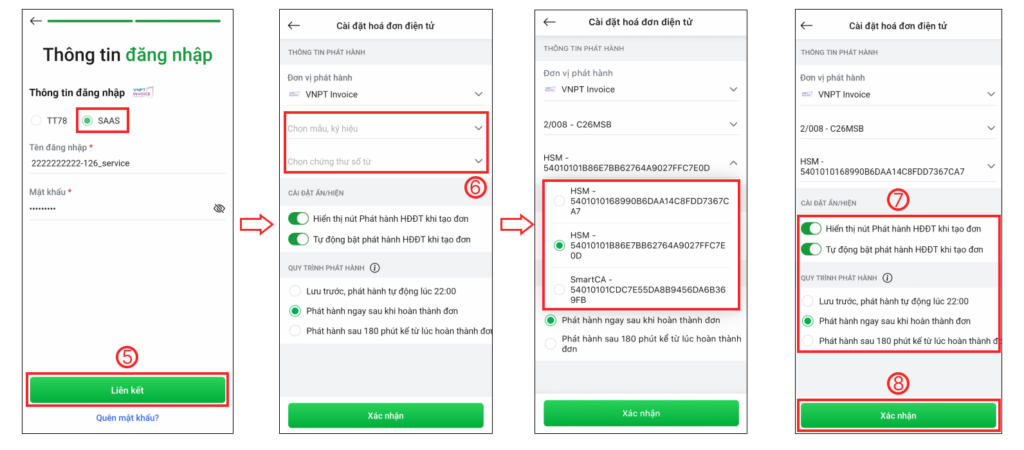 - Nhập Tên đăng nhập, Mật khẩu được VNPT cấp qua email đã đăng ký trước đó > chọn Liên kết (5) > chọn Mẫu ký hiệu, Chứng thư số HSM hoặc SmartCA (6) > Cài đặt quy trình phát hành hóa đơn (7) > chọn Xác nhận (8) để liên kết tài khoản.
