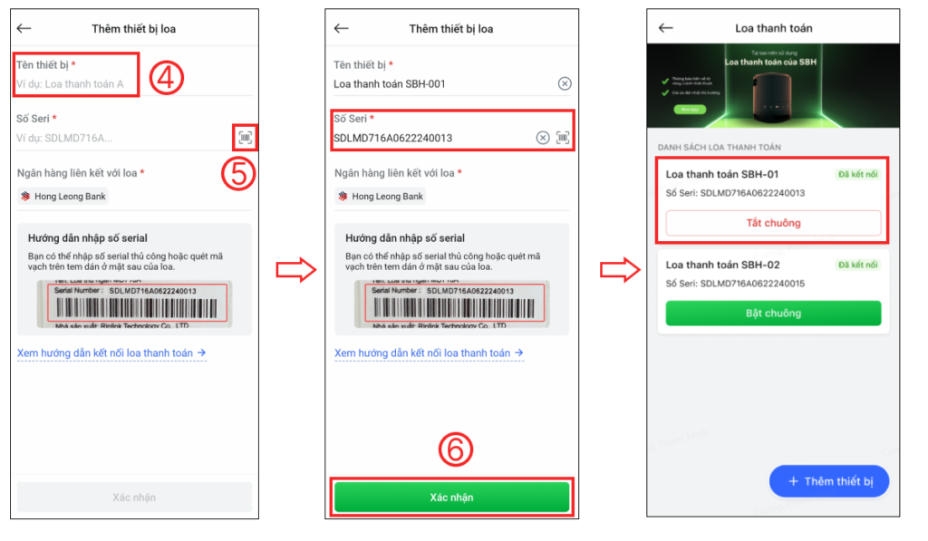 Sau khi nhập tên và số seri, bạn chọn Xác nhận (6) để kết nối. Sau khi kết nối thành công, tại màn hình loa thanh toán sẽ hiển thị thông tin loa đã kết nối, tại đây bạn có thể tùy chỉnh bật/tắt chuông nếu muốn.