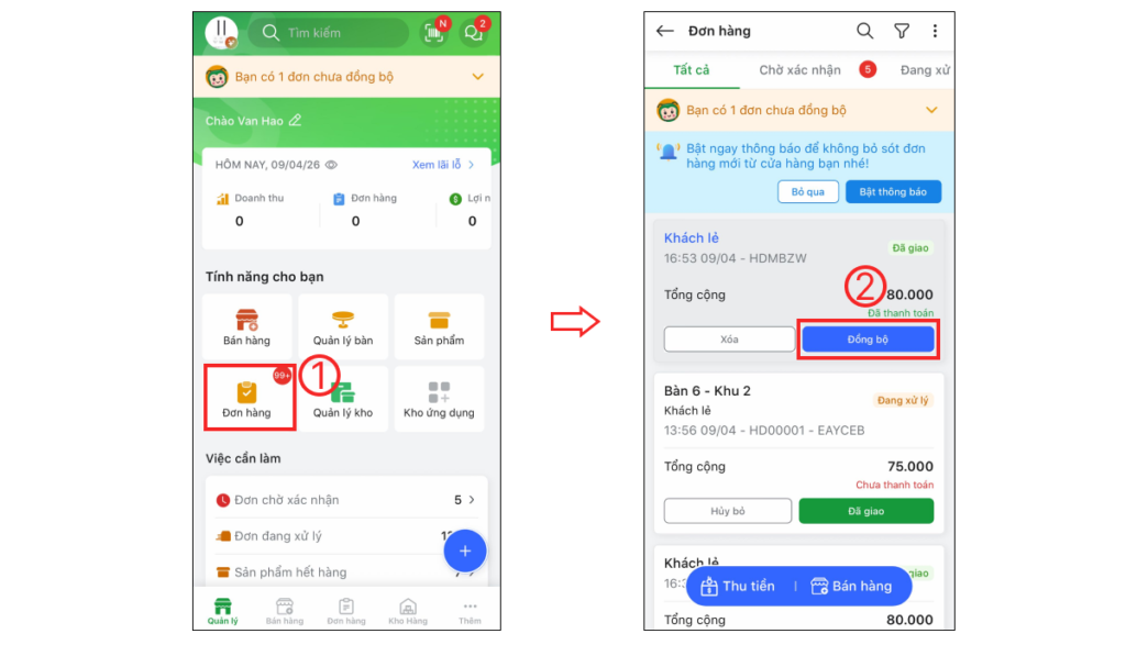 Vào mục Đơn hàng (1) > Đồng bộ (2)