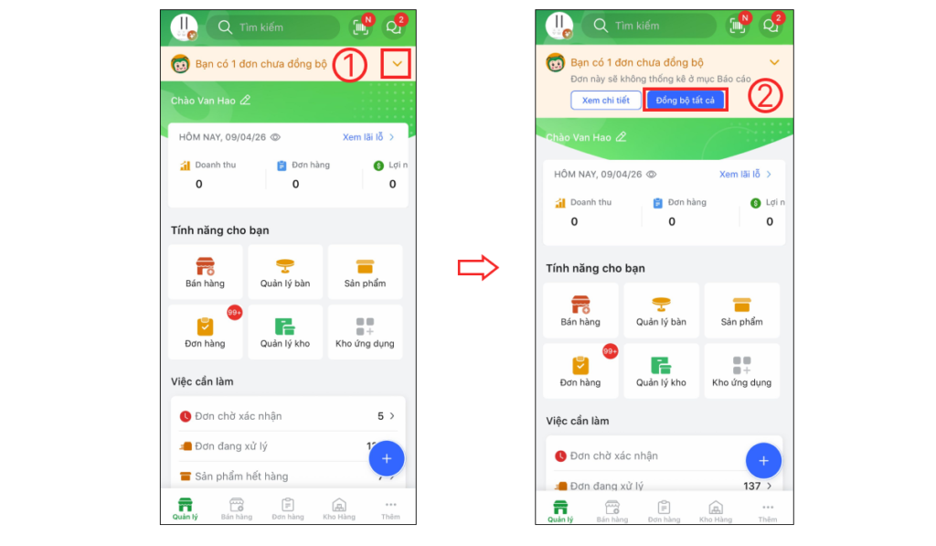 Vào mục Chọn vào mũi tên hướng xuống Bạn có đơn chưa đồng bộ > Xem chi tiết > Đồng bộ hoặc Đồng bộ tất cả bộ