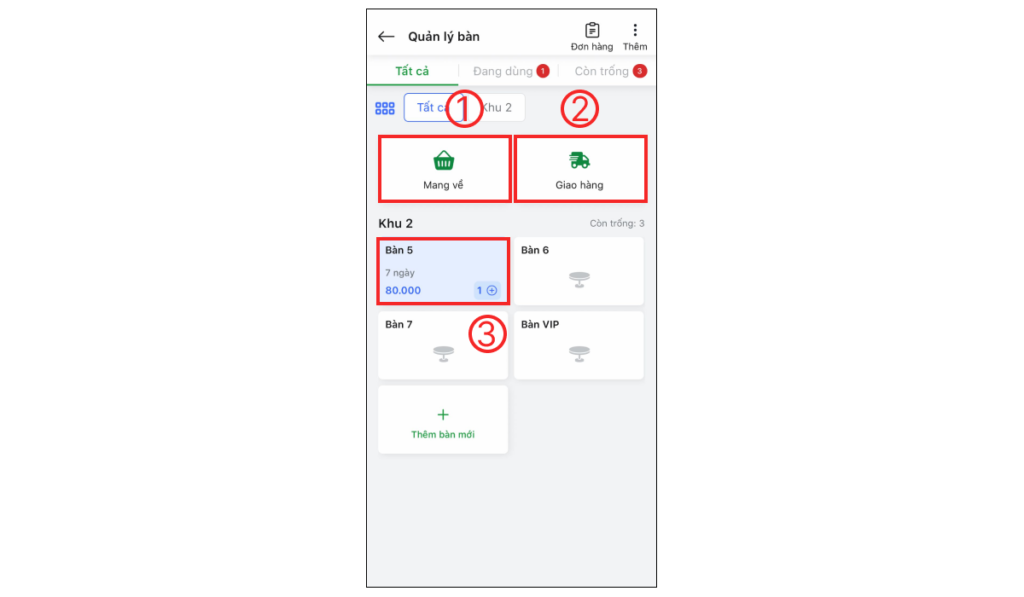 Ăn tại bàn: Giả sử khách ngồi tại cửa hàng,bạn được yêu cầu chọn bàn > Nhấn chọn bàn cho khách (3).
