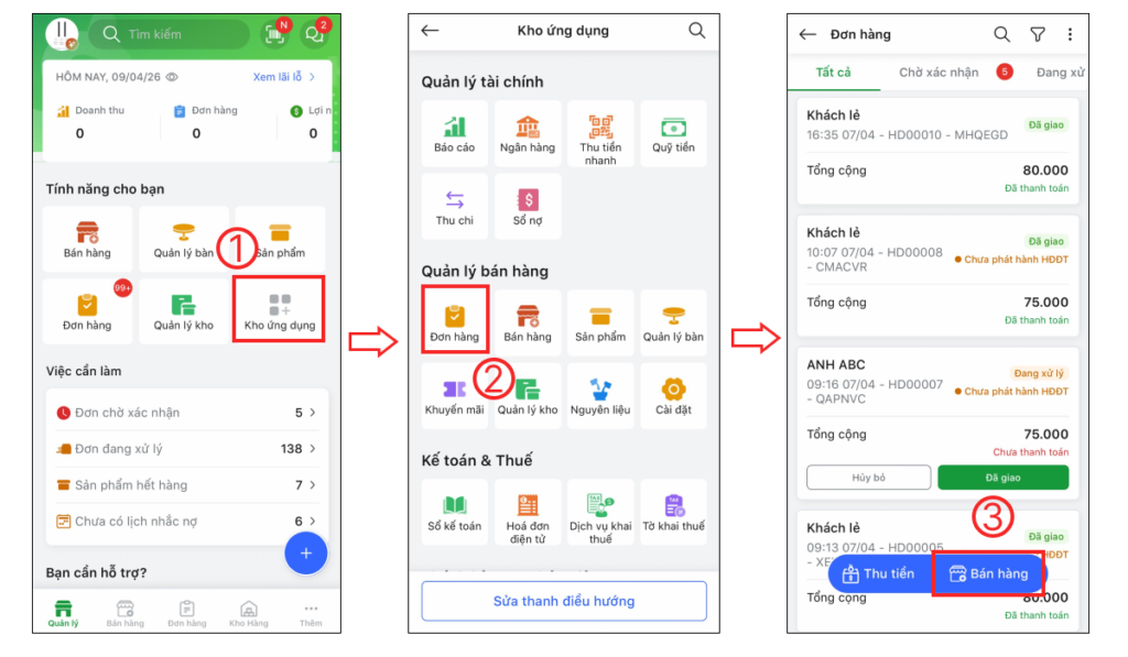 Cách 2: Tại màn hình Quản lý, bạn chọn Kho ứng dụng (1) > chọn Đơn hàng (2) > chọn Bán hàng (3).