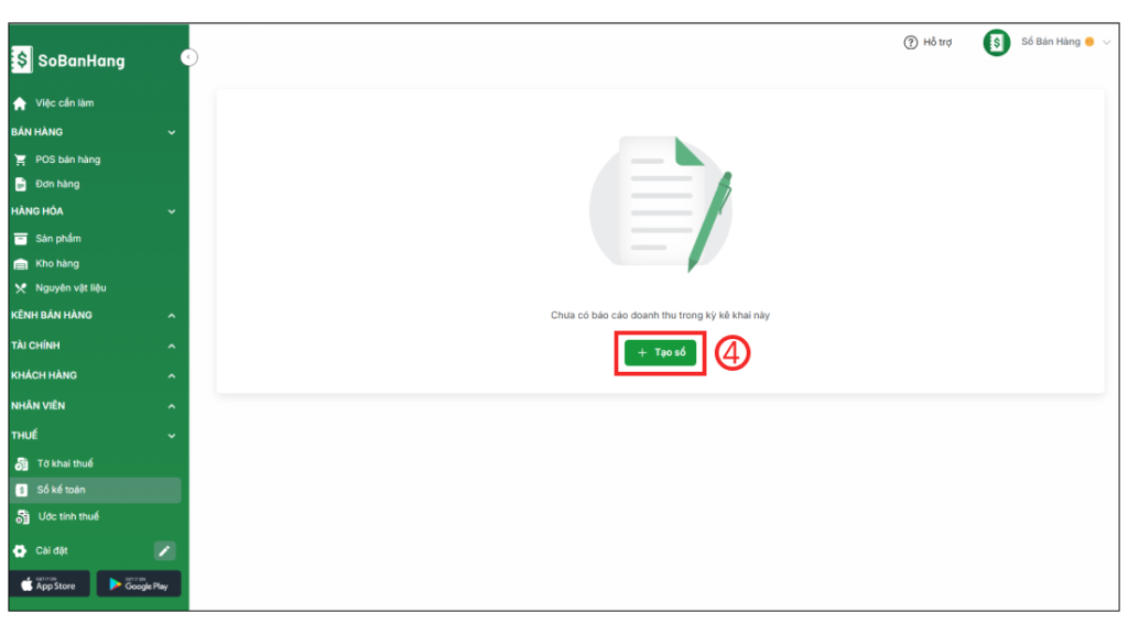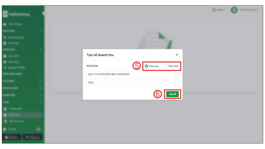 Bước 2: Chọn Tạo sổ (4) > Chọn Kỳ kê khai (Theo Quý hoặc Theo Năm) (5) > Chọn Tạo sổ (6)
