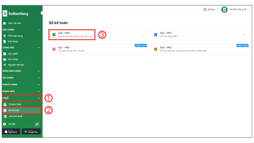 Bước 1: Truy cập vào app.sobanhang.com trên trình duyệt web máy tính, chọn Thuế (1) > Chọn Sổ kế toán (2) > Chọn Sổ S2b – HKD (3) để tạo sổ.