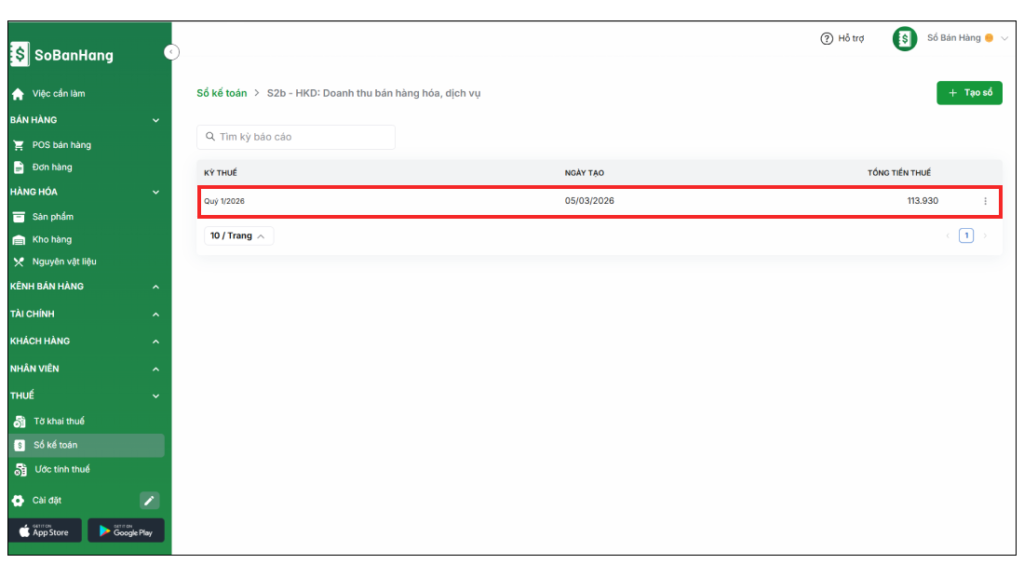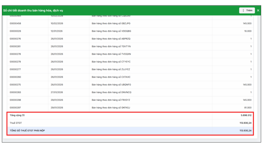 Bước 3: Sau khi Tạo sổ, hệ thống sẽ hiển thị danh sách Sổ kế toán đã kê khai theo từng kỳ. Để xem chi tiết, bạn chọn vào sổ cần xem, tại đây bạn có thể xem được chi tiết tổng số tiền tất cả những đơn hàng đã bán, Thuế GTGT và Tổng số thuế GTGT phải nộp.