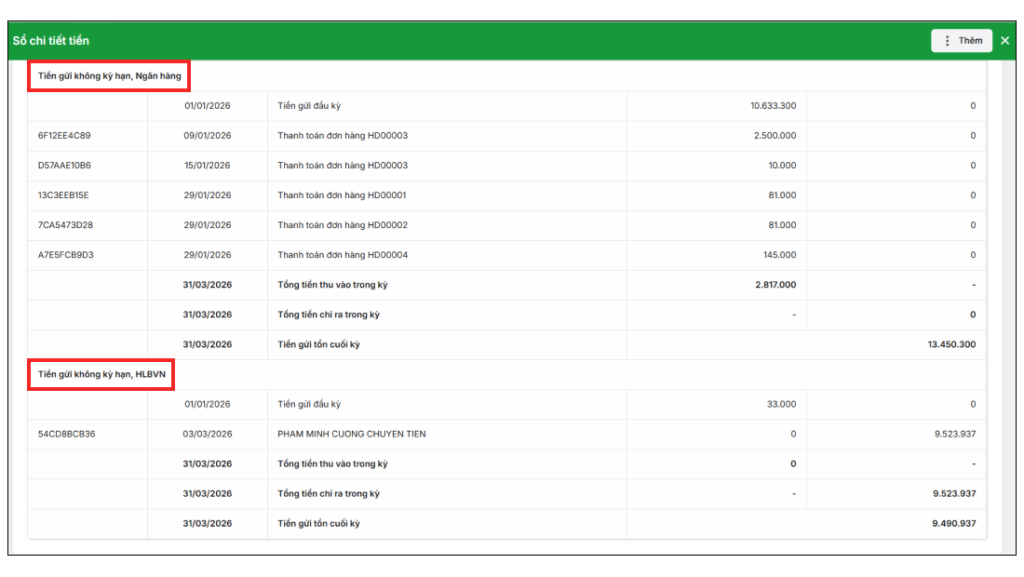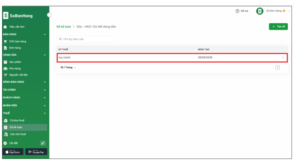 Bước 3: Sau khi Tạo sổ, hệ thống sẽ hiển thị danh sách Sổ kế toán đã kê khai theo từng kỳ. Để xem chi tiết, bạn chọn vào sổ cần xem, tại đây bạn có thể xem được chi tiết số tiền thu/chi và tiền gửi ngân hàng.