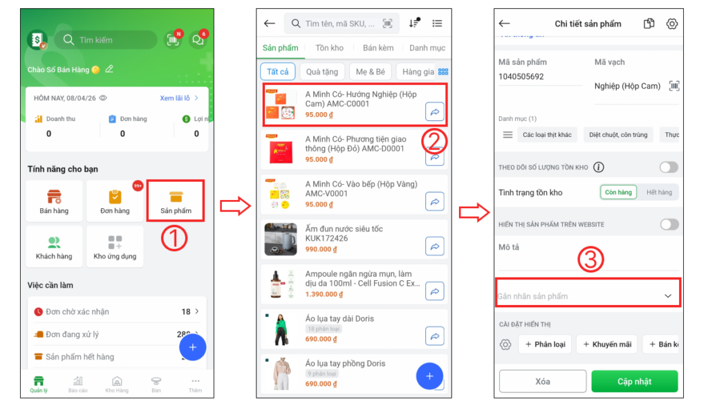 - Bước 1: Chọn Sản phẩm (1) > chọn sản phẩm cần tạo nhãn (2) > chọn Gắn nhãn sản phẩm (3)