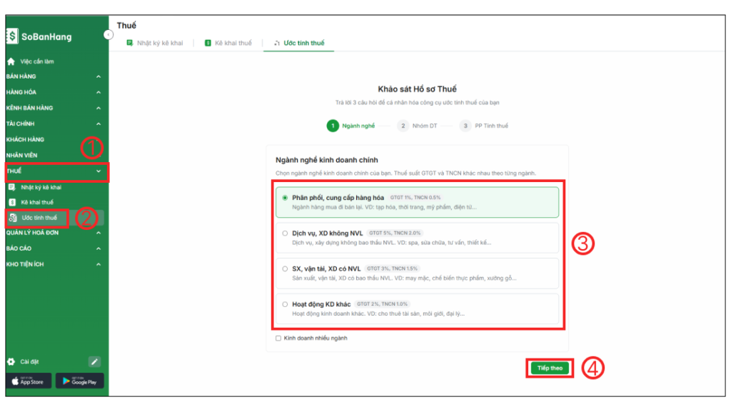 Bước 1: Truy cập vào app.sobanhang.com trên trình duyệt web máy tính, chọn Thuế (1) > Ước tính thuế (2) > chọn Ngành nghề kinh doanh (3) > chọn Tiếp theo (4)