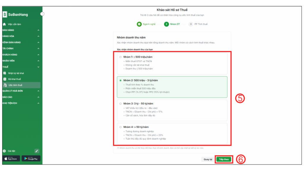 Bước 2: Chọn Nhóm doanh thu của bạn (5) > Chọn Tiếp theo (6)