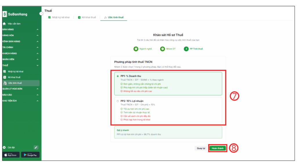 Bước 3: Chọn Phương pháp tính thuế TNCN (7), nếu bạn thuộc nhóm 2a thì chọn PP1: % Doanh thu, nhóm 2b thì chọn PP2: 15 % Lợi nhuận > bấm Hoàn thành (8) và phần mềm sẽ tự động ước tính số tiền thuế bạn cần phải nộp.