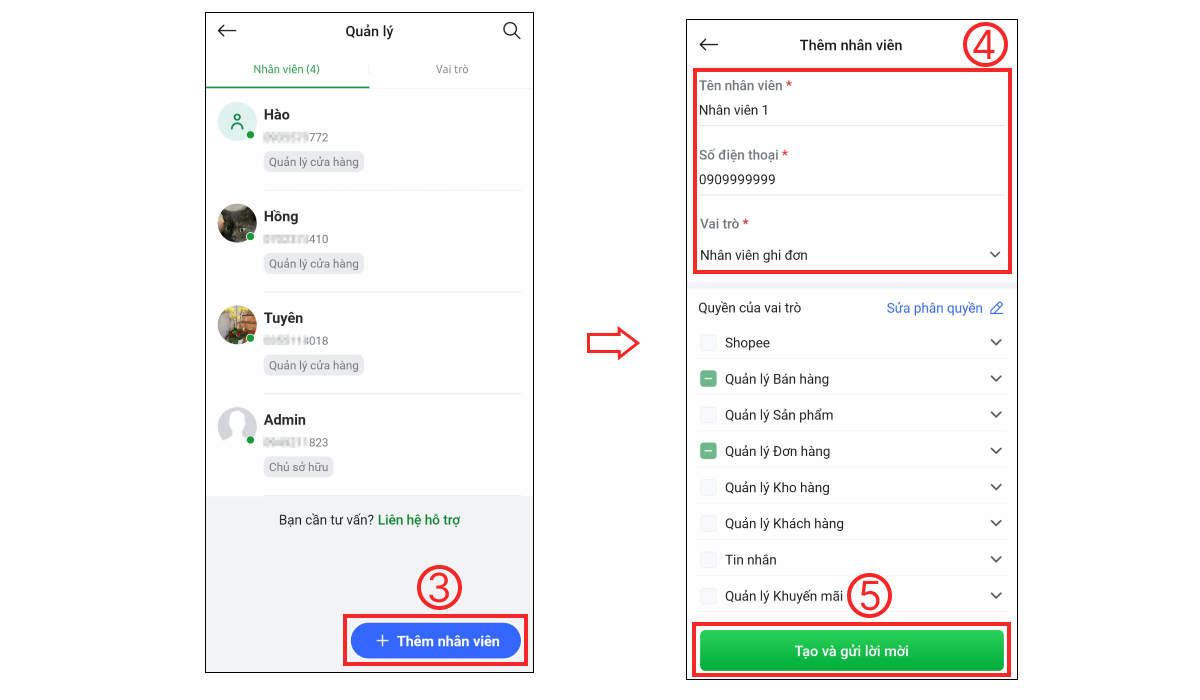 Tại trang Quản lý nhân viên, chọn Thêm nhân viên (3) > nhập thông tin nhân viên (4) bao gồm: Tên nhân viên, Số điện thoại, Vai trò, Ghi chú (nếu có) > cuối cùng chọn Tạo và gửi lời mời (5) để thêm nhân viên vào cửa hàng.