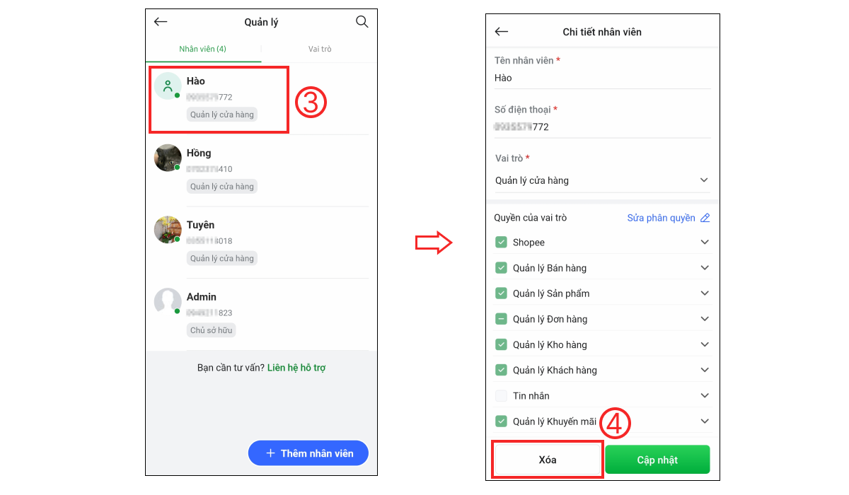 Bước 2: Tại trang Quản lý nhân viên, chọn nhân viên cần xoá (3) > chọn Xoá (4)