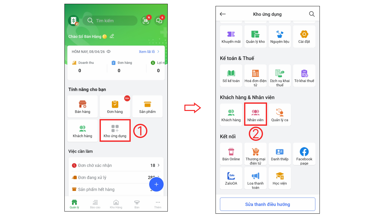 Bước 1: Tại màn hình chính, ban chọn Kho ứng dụng (1) > chọn Nhân viên (2)