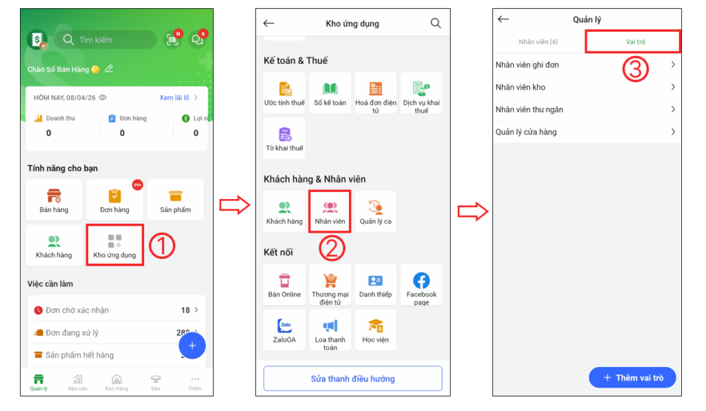 Tại màn hình chính, bạn chọn Kho ứng dụng (1) > chọn Nhân viên (2) > Vai trò (3)
