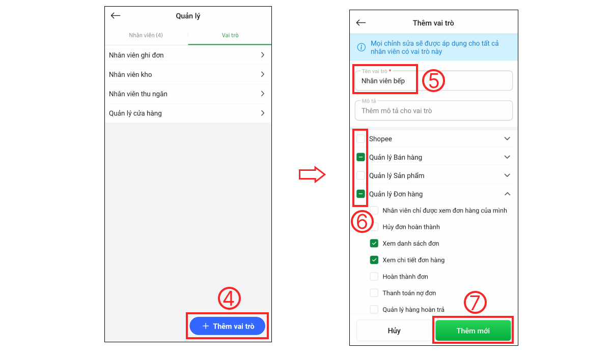 Tại trang Quản lý vai trò, bạn chọn Thêm vai trò (4) > đặt tên cho Vai trò (5) và thêm mô tả (nếu có) > tích chọn vào tính năng bạn muốn nhân viên được quyền sử dụng (6) > cuối cùng chọn Thêm mới (7) để thêm vai trò.