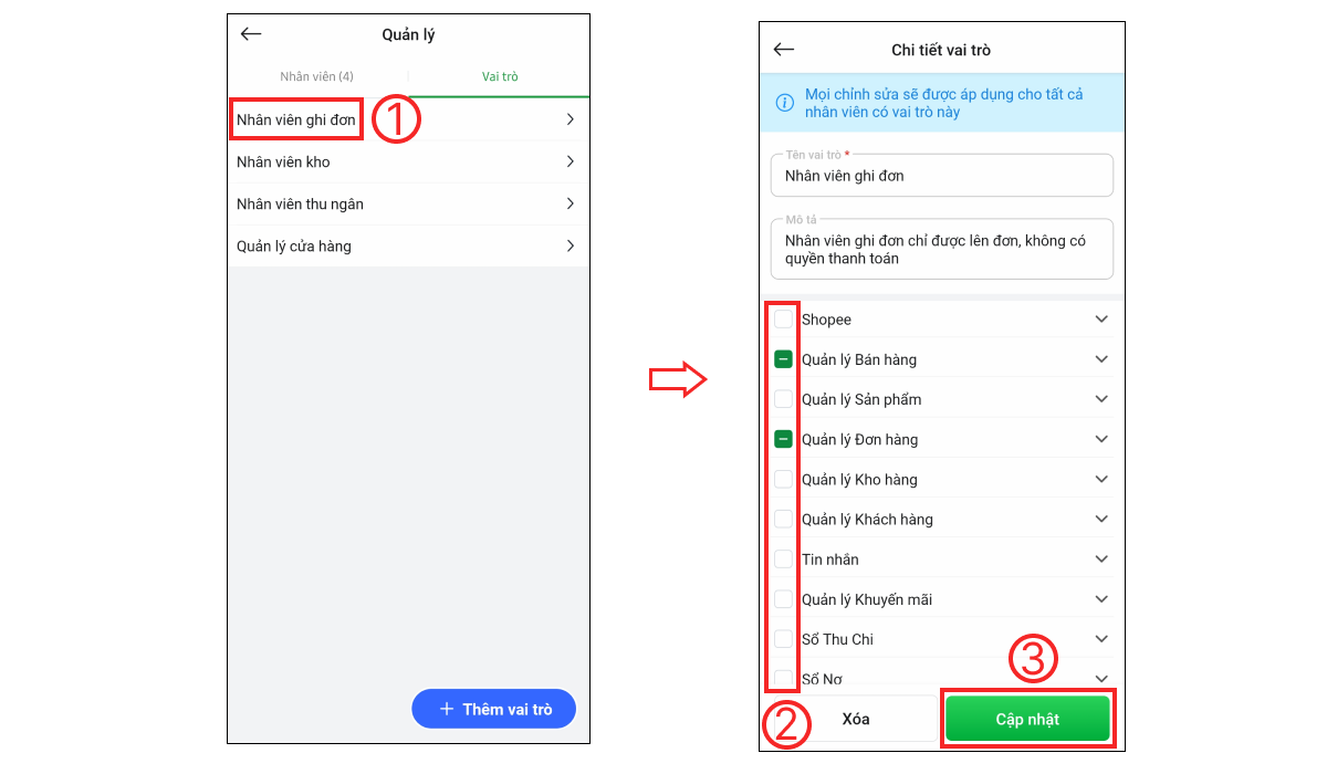 Tại trang Quản lý vai trò, bạn chọn Vai trò cần chỉnh sửa phân quyền (1) > chọn lại các mục được phân quyền (2) > bấm Cập nhật (3) để lưu lại.