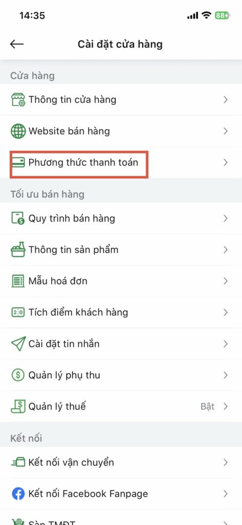 Bước 1: Chủ kinh doanh vào mục “Cài đặt cửa hàng” – Chọn “Phương thức thanh toán”