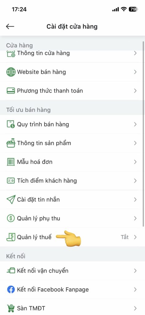 Bước 1: Chủ kinh doanh vào mục “Cài đặt cửa hàng” – Chọn “Quản lý Thuế”