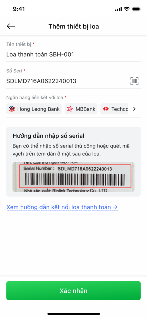 Bước 3: Nhập số serial thủ công hoặc quét mã vạch trên tem dán phía sau loa