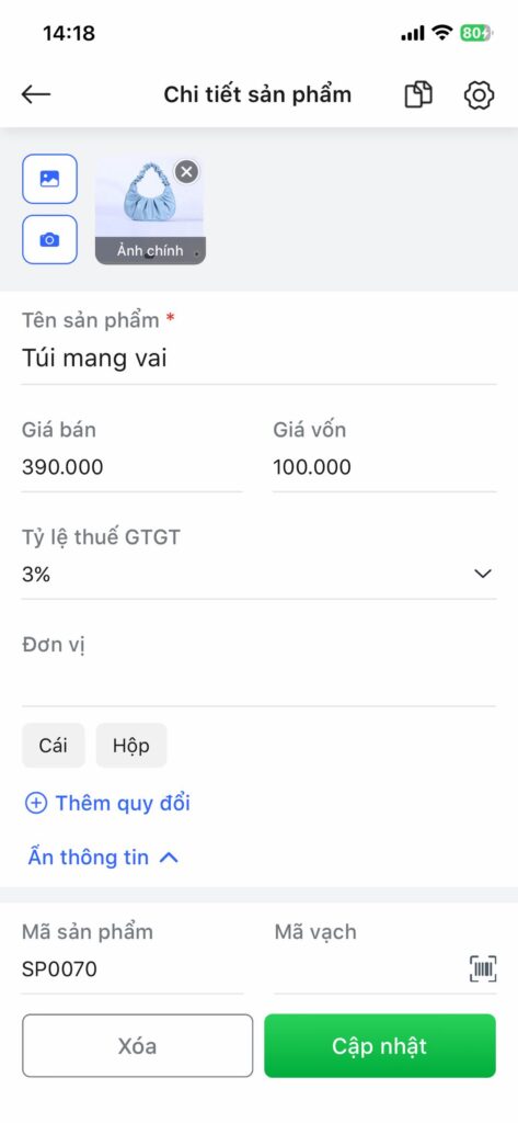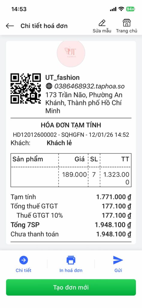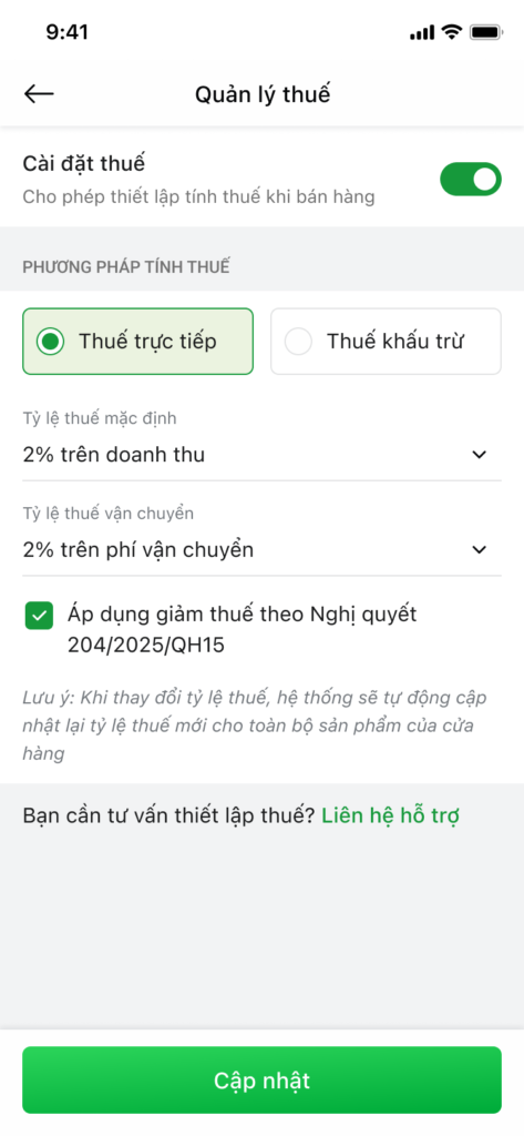 Một trong những điểm cốt lõi trong đợt cập nhật này là việc cho phép thiết lập thuế VAT ngay trên từng sản phẩm. Điều này giúp thuế không còn là bước xử lý phía sau, mà được kiểm soát ngay tại thời điểm bán hàng. Tính năng này đặc biệt phù hợp với nhiều quy mô hộ kinh doanh, cần phân biệt rõ phương pháp tính thuế để xuất đúng loại hóa đơn.