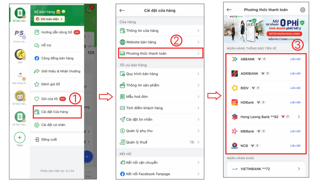 Tại màn hình Quản lý, bạn chọn vào Ảnh đại diện cửa hàng > chọn Cài đặt cửa hàng (1) > chọn Phương thức thanh toán (2)> bạn chọn liên kết 1 trong 3 ngân hàng có hỗ trợ Tạo mã VietQR Pro và đối soát tự động là ABBANK, AGRIBANK, BIDV, HDBank, Hong Leong Bank, MBank, NCB (3).