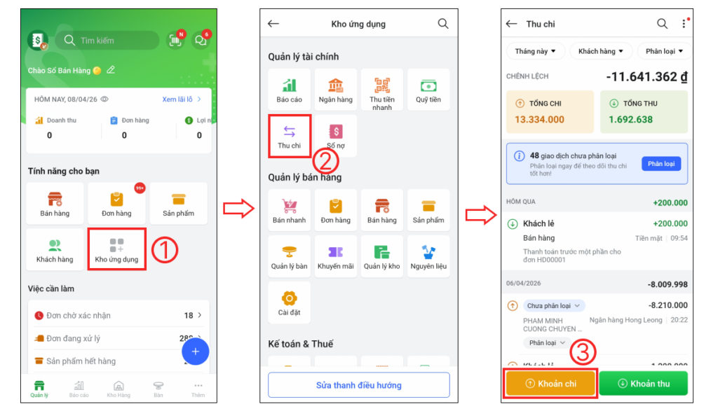 Tại màn hình Quản lý, bạn chọn Kho ứng dụng (1) > chọn Thu chi (2) > chọn Khoản chi (3)