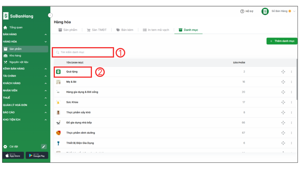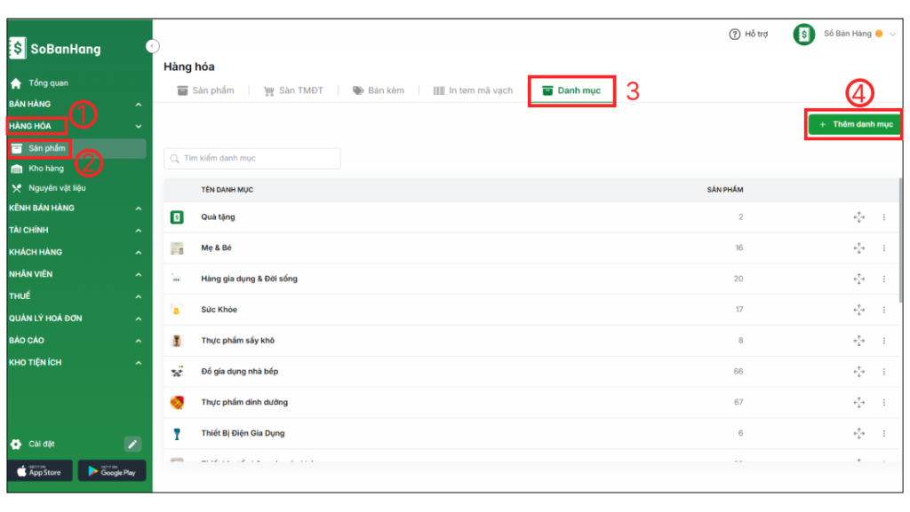 Bước 1: Truy cập vào app.sobanhang.com trên trình duyệt web máy tính > chọn Hàng hóa (1) > Sản phẩm (2) > chọn Danh mục (3) > chọn Thêm danh mục (4)