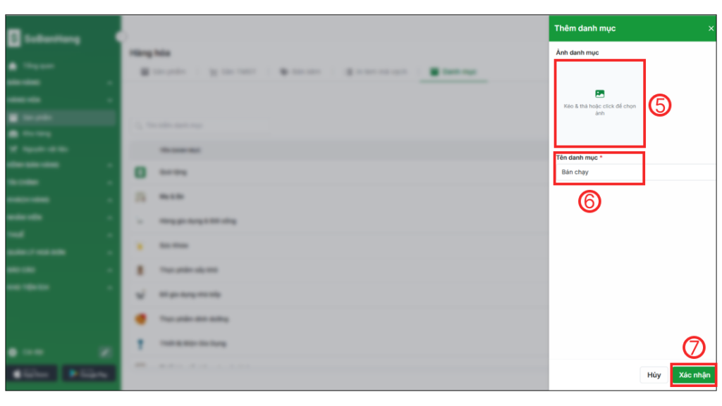 Bước 2: Chọn ảnh cho danh mục (5) để thêm ảnh cho danh mục (nếu có) > Nhập tên danh mục (6) > bấm Xác nhận (7) để tạo danh mục sản phẩm.
