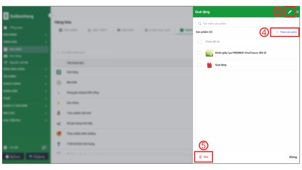 Tại trang Quản lý Danh mục, bạn chọn vào thanh tìm kiếm (1) để tìm danh mục cần chỉnh sửa > chọn Danh mục cần sửa (2) > chọn vào biểu tượng cây viết (3) để chỉnh sửa tên hoặc cập nhật ảnh cho danh mục. Để thêm sản phẩm vào danh mục, chọn Thêm sản phẩm (4) để thêm. Để xóa danh mục, chọn Xóa (5) để xóa danh mục.