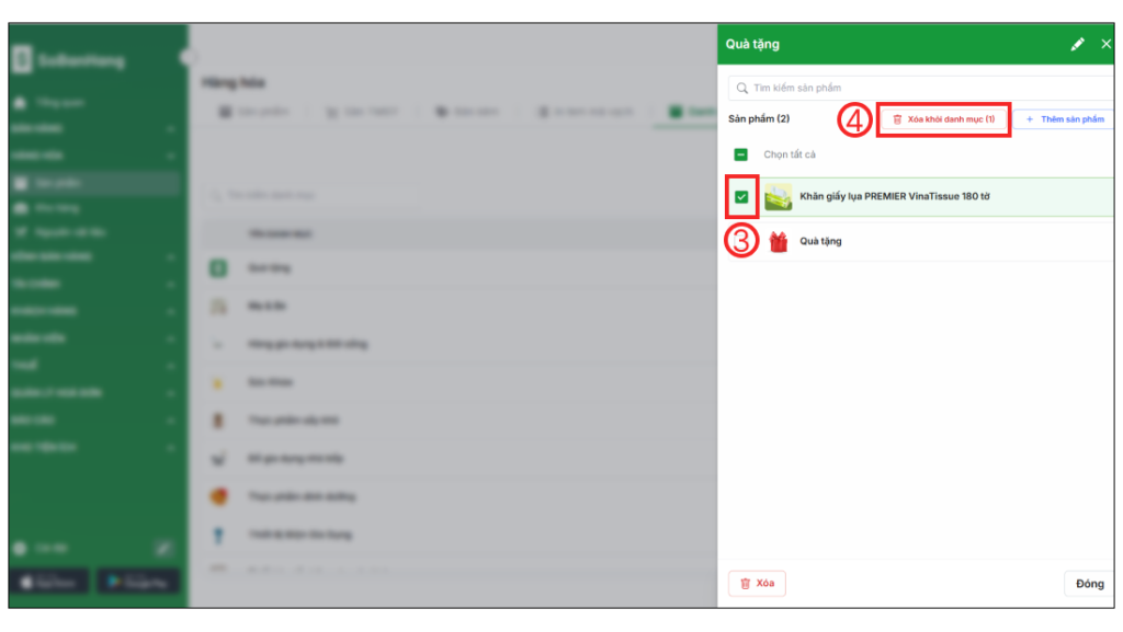 Tại trang Quản lý Danh mục, bạn chọn vào thanh tìm kiếm (1) để tìm danh mục cần xóa sản phẩm > chọn Danh mục cần sửa (2) > chọn sản phẩm cần xóa (3) > chọn Xóa khỏi danh mục (4) để xóa sản phẩm ra khỏi danh mục.