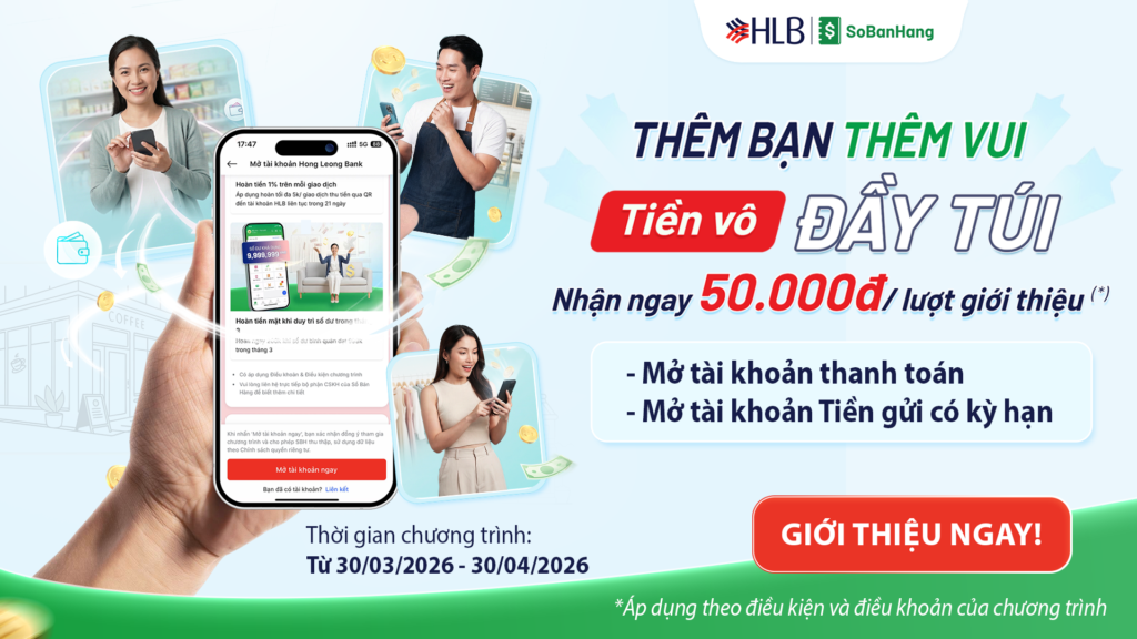 Trong bối cảnh các chương trình ưu đãi ngày càng tập trung vào trải nghiệm và lợi ích thực tế cho người dùng, Sổ Bán Hàng và Ngân hàng Hong Leong Việt Nam triển khai chương trình “Thêm bạn thêm vui – Tiền vô đầy túi”. Đây là cơ hội để khách hàng hiện hữu vừa kết nối với bạn bè sử dụng dịch vụ ngân hàng, vừa nhận thưởng tiền mặt hấp dẫn với cơ chế đơn giản, dễ tham gia.