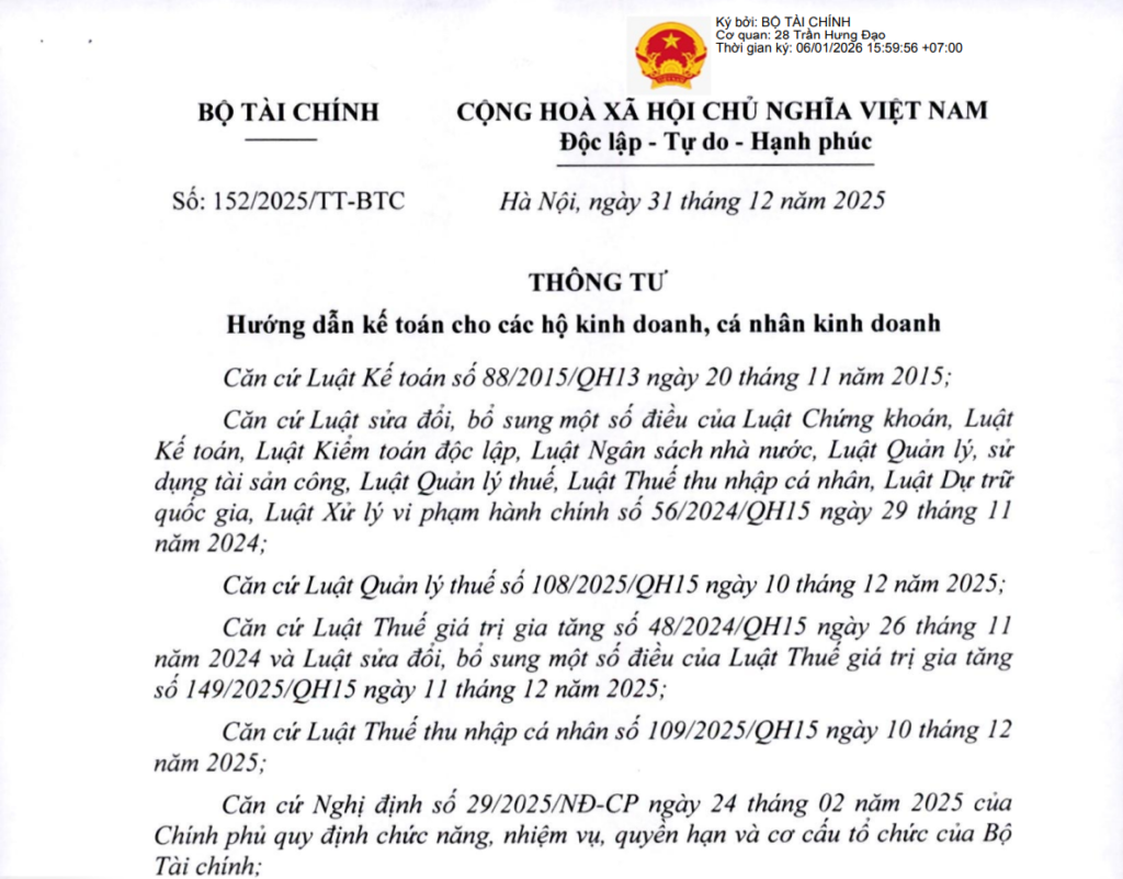 Bộ Tài chính chính thức ban hành Thông tư 152/2025/TT-BTC có hiệu lực từ ngày 1/1/2026 THAY THẾ HOÀN TOÀN Thông tư Thông tư số 88/2021/TT-BTC, hướng dẫn chế độ kế toán đối với hộ kinh doanh và cá nhân kinh doanh.
